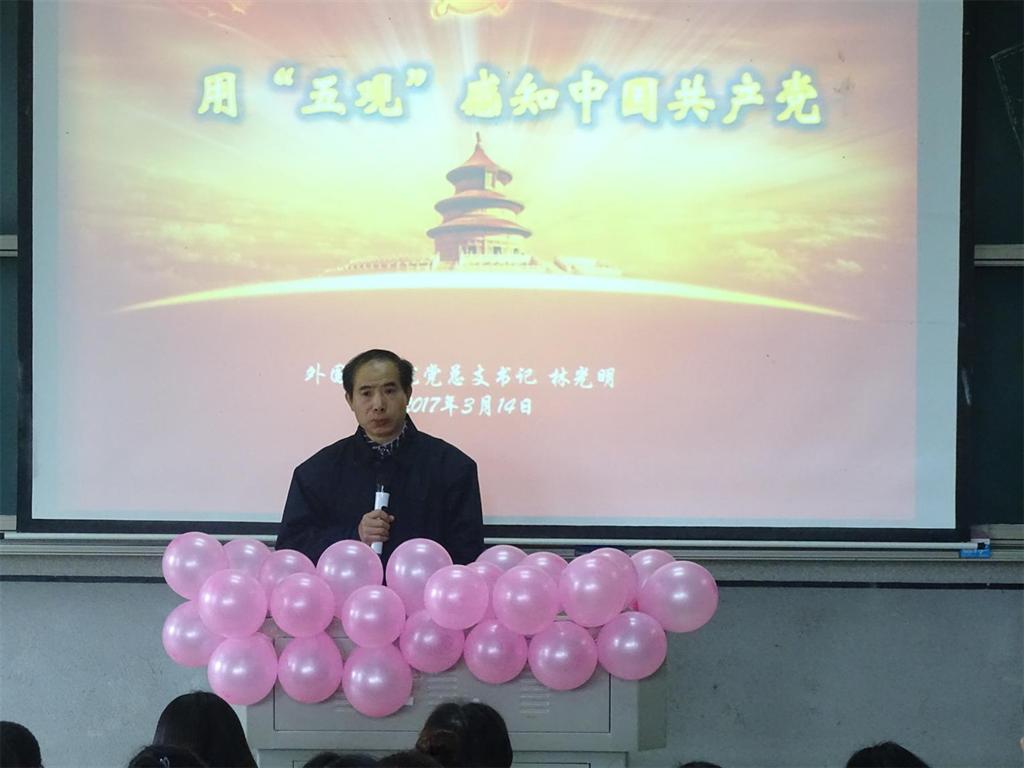首先,林光明书记作了《用“五观”感知中国共产党》的专题报告。林书记深入浅出、引经据典,指引党员同志们从历史观、文化观、人民观、世界观、实践观五个维度,全方位地了解和理解中国共产党强大的战斗力、凝聚力以及生命力。林书记鼓励大家以身作则,发挥榜样作用吸引更多的同学献身于党的事业,为人民服务。