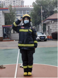 为获得更好的体验效果,杨教官拿出三套消防服让志愿者进行消防服试穿速度大比拼,志愿者争先上前体验“我是小小消防员”。一整套的消防服十分笨重,约有四五十斤。志愿者积极尝试,表示并不容易,纷纷向杨教官和消防员敬礼。