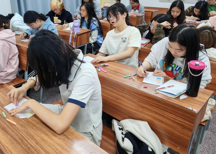 活动由各班朋辈心理互助员主持,精心设计了兼具趣味性和专业性的多个环节。在"情绪词汇卡片叠罗汉"和绘制"专属情绪小瓶子"等互动游戏中,同学们在轻松愉快的氛围中打开心扉,增进彼此了解。此外,互助员们还引入心理学专业的"情绪ABC理论",通过贴近学生生活的案例分析,帮助大家理解情绪产生的内在机制,掌握科学应对方法。