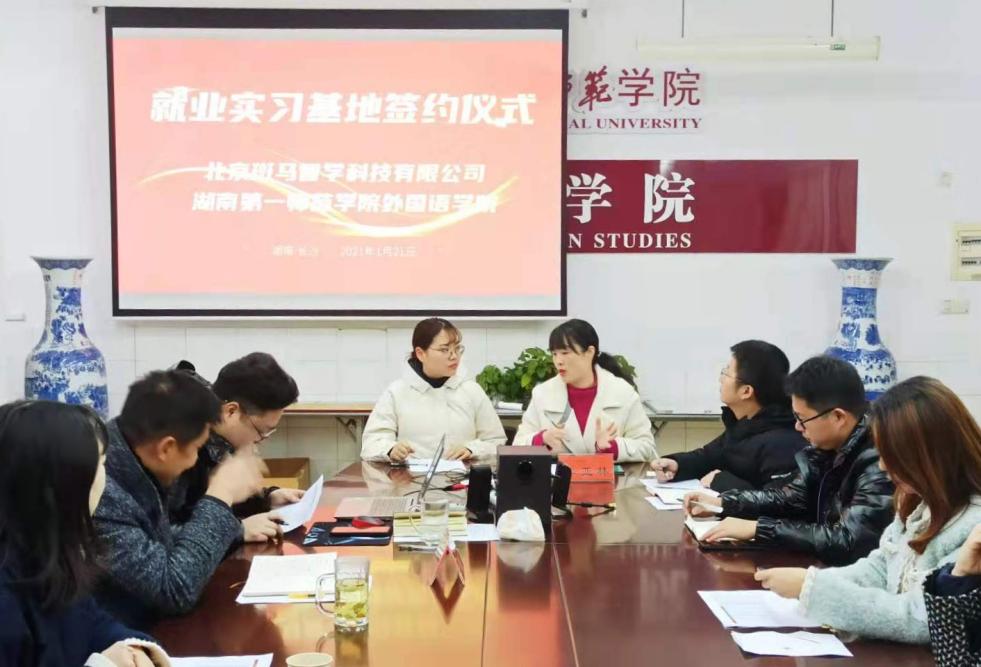 2021年1月21日上午, 成人有声小说 与北京斑马智学科技有限公司签订了校企合作实习就业基地协议。学院党总支书记李亚林、党总支副书记杨虎智、北京斑马智学科技有限公司长沙分公司人力资源经理郎苗苗,以及双方代表等共13人参加签约仪式。