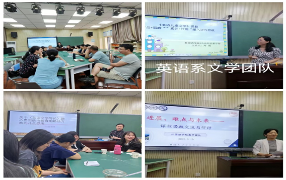 本次活动主题为“进展、难点与未来——成人有声小说 教学团队课程思政交流与研讨”,活动邀请到七位教师作经验分享报告。文学团队王春晖副教授就课程思政的指导思想和内涵,英美文学课程思政的必要性和可行性,思政元素挖掘难、融入难和系统构建难进行了阐述。她从转变理念、科学挖掘、改革方法、创新模式、阶梯推进五个方面进行了说明,并展示了英美文学课程思政教学案例。刘霞老师对“英语儿童文学”课程的思政改革创新与教学实践进行了经验分享。她讲述了在儿童文学教材编写中如何进行课程思政元素的有机融入,以凸显整体性、思想性、融合性和创新性特征。刘霞老师以生动的案例展示了“英语儿童文学”课程思政教学中“引导”和 “融合”的两个关键环节。欧丽萍博士结合“英语文学导论”课程特点,对课程思政融入专业课教学的措施进行了详细分析。她提出找准思政元素是基础,科学合理的教学方法是保障,合理量化的考核是检验效果的重要指标。英语系教学主管、2021年全国外语课堂思政教学案例特等奖获得者李双老师就三位教师的发言进行了精彩点评,指出三位教师课程思政教学中的亮点和可以提升的地方。