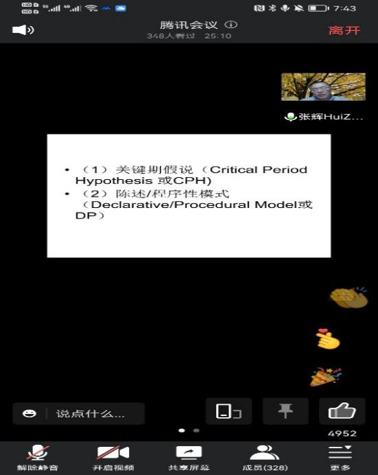 2022年4月14日(星期四)晚上,我国著名学者张辉教授应 成人有声小说 “刘明东中、小学英语学科导师工作坊”邀请,为 成人有声小说 师生做了一场题为“二语习得和加工假说:观点、证据与分歧”的线上学术讲座。讲座由刘祥清书记主持,刘宇松副院长等党政领导与300多名师生聆听了此次讲座。