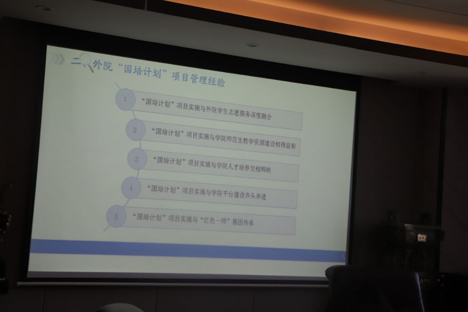 刘院长首先介绍了学院“国培计划”项目管理基本情况;分享了外院“国培计划”项目管理经验:一是“国培计划”项目实施与外院学生志愿服务深度融合;二是“国培计划”项目实施与学院师范生教学资源建设相得益彰;三是“国培计划”项目实施与学院人才培养交相辉映;四是“国培计划”项目实施与学院平台建设齐头并进;五是“国培计划”项目实施与“红色一师”基因传承。刘院长还就外院“国培计划”项目管理提质提出几点设想:一是利用“国培计划”项目助力学院中小学英语教学研究;二是利用“国培计划”项目创新学生志愿者服务活动;三是利用“国培计划”项目促进学院师范生学业指导与就业工作;四是利用“国培计划”项目助推学院高质量发展。