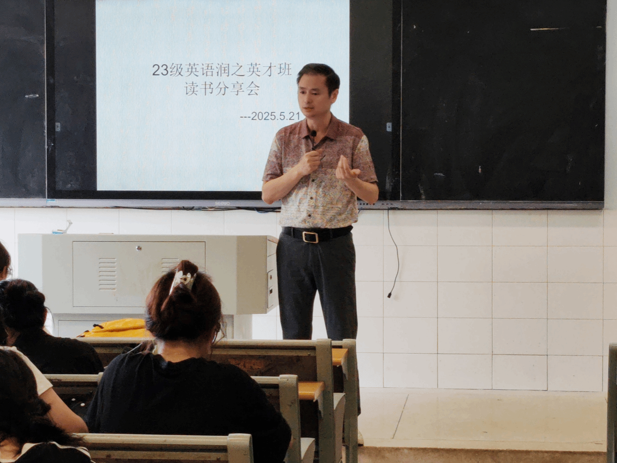 2025年5月21日下午,23级英语润之英才班“文学的魅力与探索”读书分享会在怀中北110教室隆重举行。活动以经典与当代文学的跨时空对话为核心,吸引了班级全体同学参加。学院何培森书记、胡靓博士、罗海燕老师参加并做指导,现场气氛热烈,书香弥漫。