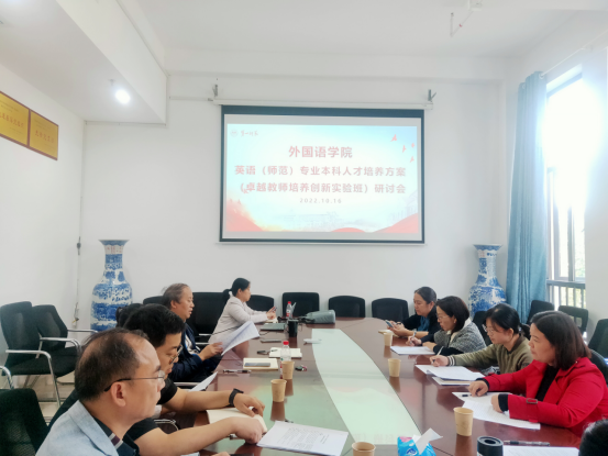 2022年10月16日, 成人有声小说 在百熙楼223召开英语专业卓越教师培养创新实验班本科人才培养方案研讨会,院党委书记刘祥清,副院长(主持工作)陈圣白,副院长唐文杰、康响英,院党委副书记禹晗,英语系主任张昀霓,陈艳君博士,王佳娣博士,王小玲老师,以及院党政办、教务办老师参会。唐文杰主持会议。