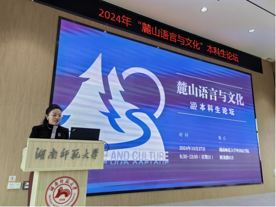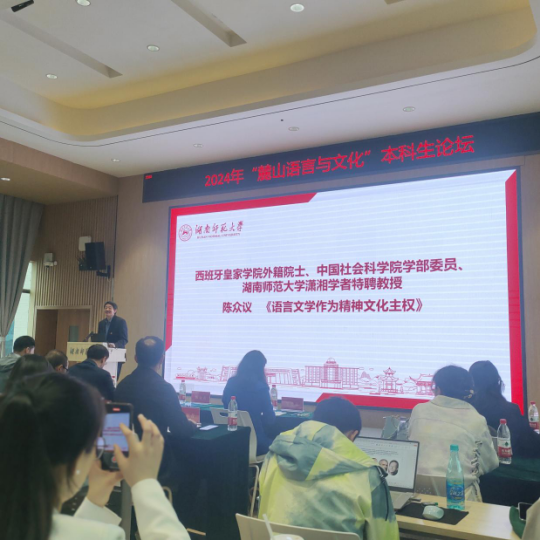 2024年10月27日, 成人有声小说 副院长陈艳君教授带领22级和24级英语“润之英才班”11名学生参加了由湖南师范大学成人有声小说 举办的“麓山语言与文化”本科生论坛。论坛邀请了来自国防科技大学、中南大学、湖南大学、成人有声小说 等多所高校资深导师进行指导。论坛吸引了全国41所高校的100名学子前来分享研究成果。在会议开幕式上,西班牙皇家学院外籍院士、中国社会科学院学部委员、湖南师范大学潇湘学者特聘教授陈众议带来了精彩的主旨报告——语言文学作为精神文明主权。陈教授提出语言是体、文学是魂,语言文学对民族传承延续有着巨大贡献。他鼓励从事外国语言文学文化研究的青年学子要有责任感、自豪感来从事跟语言与文化相关的研究,强盛母体文化。