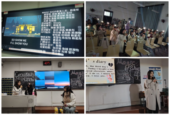 本次英语角的主题为创意表演秀,分为三个环节,分别是舞台剧表演、问答以及游戏环节。在第一个环节中,24级英语润之班的15名同学准备了一场名为MAGIC SHOP的舞台剧,讲述了两位刚毕业的音乐生在海边开了一家名为MAGIC SHOP的便利店,并在此便利店治愈了友情破损的怅然,亲人离去的悲痛,灵感丧失的遗憾,新家融入的茫然的故事。表演秀后,同学们进行了配音、友情明信片和友情通话等游戏。