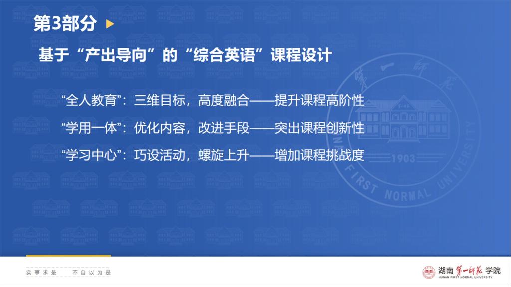 李双老师从“综合英语”的课程改革与发展历程、金课的“共性”和外语金课的“个性”、“综合英语”金课建设的理论框架和设计实施、未来展望四个方面分享了“综合英语”课程团队的课程建设经验。她指出,产出导向的“全人教育”、“学用一体”和“学习中心”与金课的“两性一度”要求是高度契合的,并从中观、微观两个角度分享了基于“产出导向”的综合英语课程整体设计和两个单元教学案例,讲述课程团队如何从“三维目标,高度融合”、“优化内容,改进手段”、“巧设活动,螺旋上升”三个方面提升课程高阶性、突出课程创新性、增加课程挑战度。