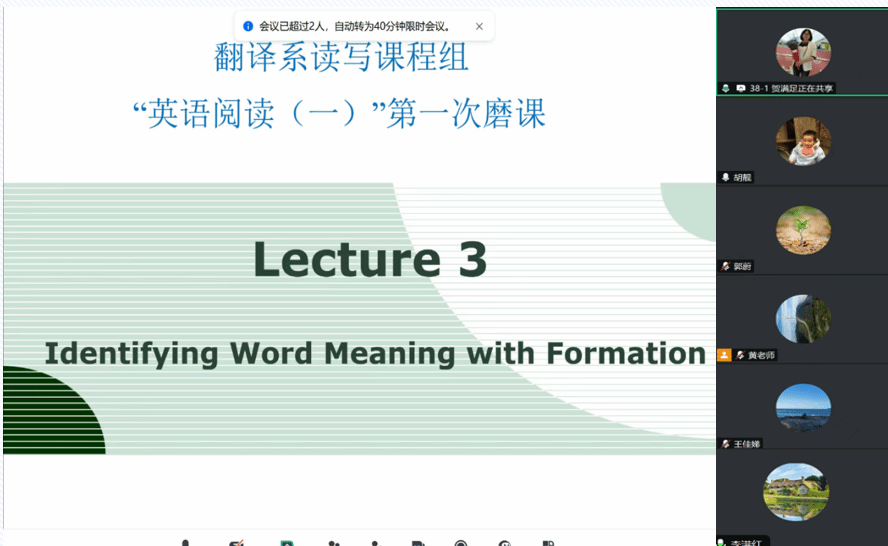 贺满足老师首先介绍《英语阅读(一)》课程本学期的教学安排:前期五周开展阅读技巧专项训练,后续推进篇章阅读。“根据上下文猜测词义”是阅读课程的重难点,也是本次磨课的重点内容。贺满足老师阐述了教学流程和主要的教学内容。 针对研讨环节,教师们积极献策:王佳娣副院长提出需要首先确定“阅读与技巧训练结合”主线,保障教学方向,凸显阅读课程核心;郭蔚老师建议让学生自主列举词根词缀以调动他们学习的主动性;胡靓博士建议篇章阅读课前提供背景知识、归纳主题词汇,还提议从政治文本切入,归类词根词缀。此外,组内成员重点探讨“规范引导学生使用AI”,全组达成共识,需要进一步探索AI辅助英语阅读教学的合理路径。