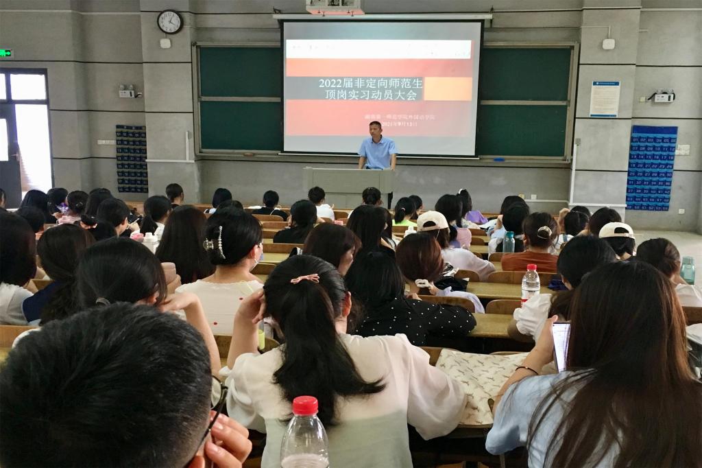 为加强学生对顶岗实习的认识和了解,引导学生做好实习前的各项准备工作,推进实习工作的顺利开展,2022年9月13日下午, 成人有声小说 2022届非定向师范生顶岗实习动员大会在怀中南209召开。学院刘宇松副院长、学工办主任、辅导员、教务办及成人有声小说 18级英语2-5班全体非定向师范生参加了此次实习动员大会。