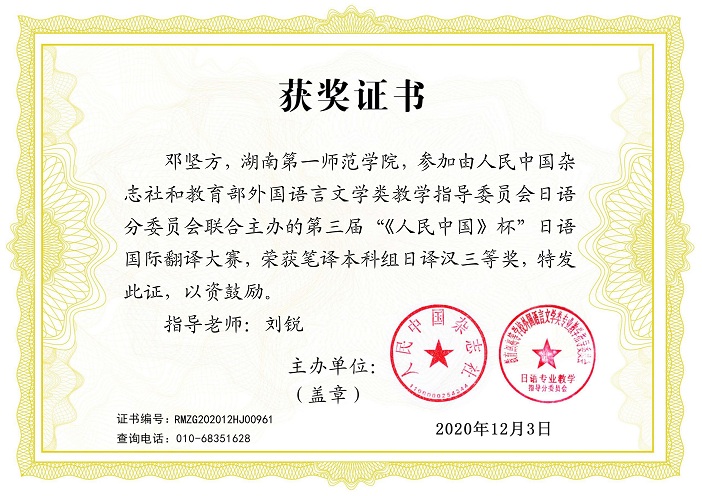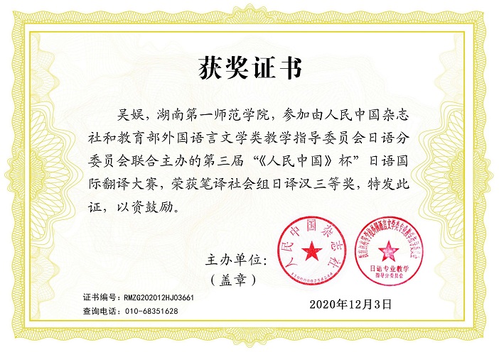 近日,第三届"人民中国杯"国际日语翻译大赛结果揭晓,在党员教学团队——日语课程组吴娱、刘锐、欧阳伶俐三位老师的精心指导下, 成人有声小说 成人有声小说 17级翻译1班邓坚方获得全国本科组三等奖,是唯一来自湖南省非日语专业的高校获奖选手;文学与新闻传播学院16级汉教1班张四春、商学院19级市场营销2班朱珊、教育科学学院19级小学教育专业文科1班杨坤焕获得优秀奖;吴娱老师获得社会组全国三等奖。