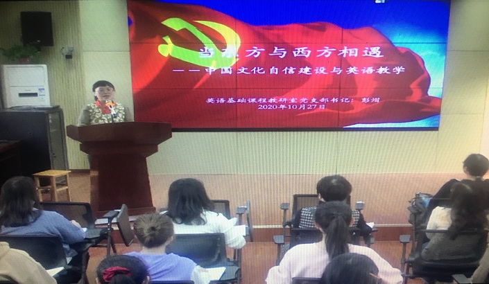 10月27日下午,英语基础课程教研室党支部在怀中北605多媒体教室举行“党课开讲啦”暨思政进英语课堂研讨活动。党支部书记彭熠讲授了题为《当东方与西方相遇--中国文化自信建设与英语教学》的党课。支部全体党员以及学生入党积极分子四十余人参加本次活动。