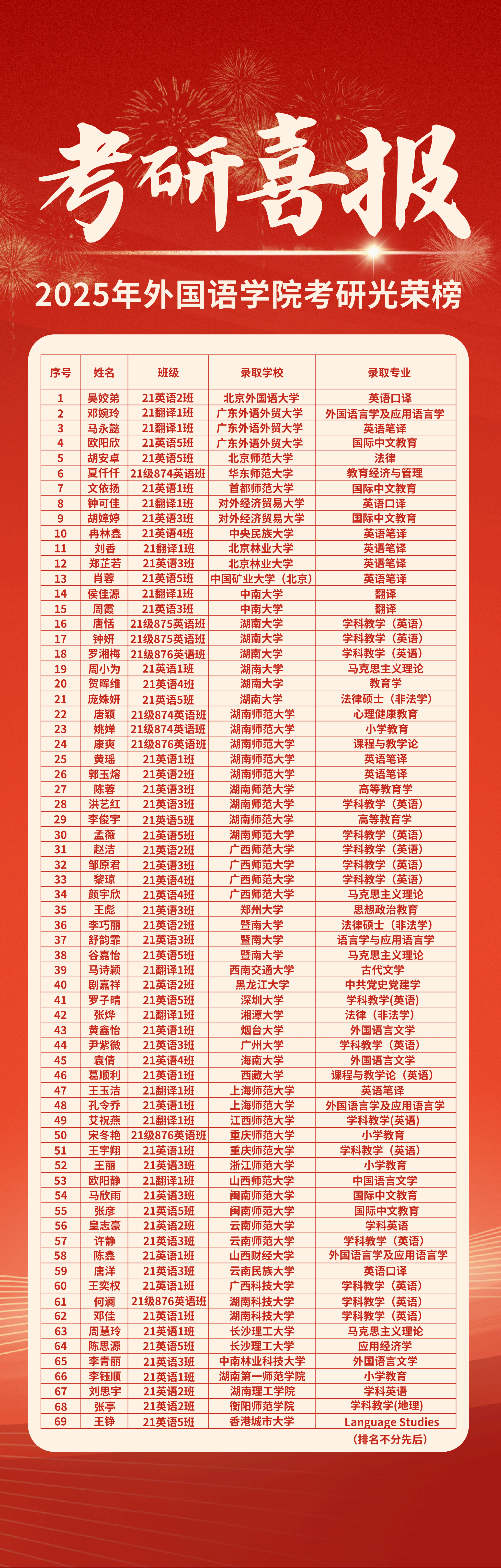 近日, 成人有声小说 2025 年考研工作捷报频传,研究生录取率再创佳绩! 成人有声小说 学子以扎实的专业功底、坚韧的奋斗精神,在激烈的竞争中脱颖而出,成功进入北京外国语大学、广东外语外贸大学、北京师范大学、华东师范大学等院校深造,交出了一份令人振奋的考研答卷。这份成绩的取得,既是同学们寒窗苦读的回报,也是学院教育教学水平与育人成果的生动展示。学院注重学风建设,全程助力考研,从专业辅导到心理疏导,全方位为学子护航。希望全院师生以此次佳绩为契机,凝心聚力,再创辉煌!